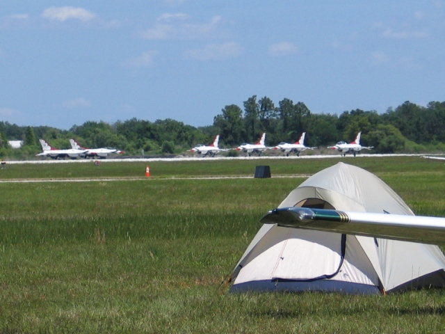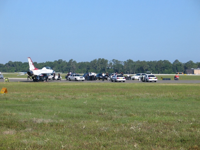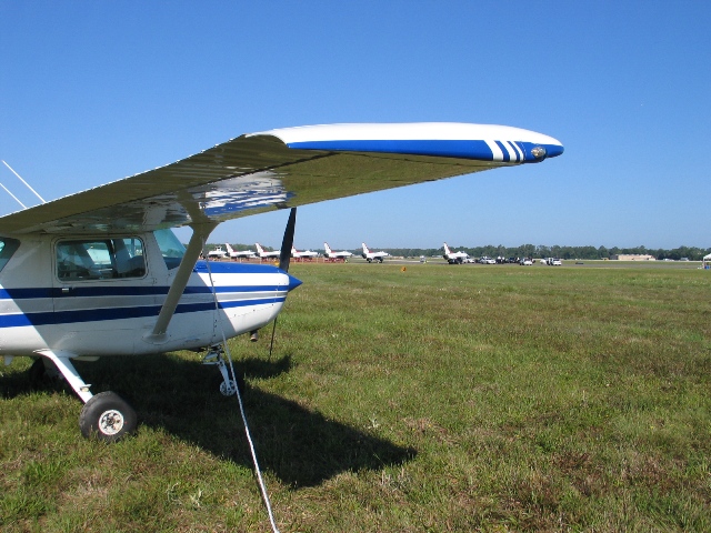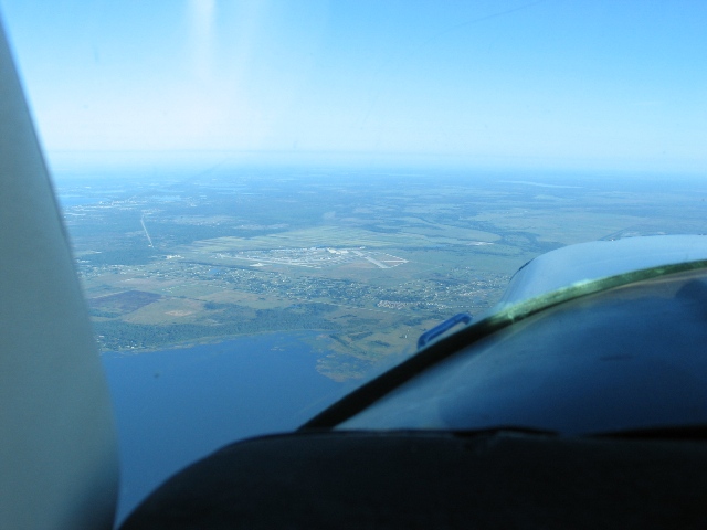 There are two really big fly-in in the US each year. Sun 'N Fun is second only to Oshkosh. Since Sun 'N Fun is held in Lakeland, Florida, and that is a lot closer to me than Oshkosh, Wisconsin is. Lakeland is a three hour drive by car, but is only about an hour and a half by plane, so of course I wanted to fly there. My original plan was to just fly up and back in one day, since that was possible with the airplane. I also decided to take a day off work, with the theory that it would be less crowded during the week than on the weekend. I finally decided to go up on Friday, but when I looked at the schedule of activities, I saw that in addition to the daily afternoon airshow, there was also an night airshow. During the airshow, the runway is closed for arrivals and departures. The runway opened up at 6 pm after the day show, but closed again at 7:30 pm for the night show. I decided I did not want to get in the middle of the traffic jam that would happen when everyone tried to leave in 90 minutes, so I decided to bring a tent and camp out next to the plane for one night, and then leave sometime Saturday morning. I had several people I know from the airport mention they wanted to ride up with me, but none of them panned out. I think it was because I was spending the night there. No matter, that made travel plans very easy, since I only had to convince myself something was a good idea. And that was usually pretty easy! Whenever you schedule a plane before they open in the morning, someone calls you to let you know what the combination is to the safe they keep in the hallway so that you can get the keys out. I usually try and call myself, just to remind them I have the plane first thing in the morning. At 8:10 pm Thursday night, I realized that I had forgotten to call them, and they had not called me. I tried calling the office, but they are only open until 8 pm, and had already left. Shoot! That is why I call them myself! I looked at the online schedule, and saw that one of the instructors had a lesson a 7 am, so I would just show up then and he could get me the keys. My plan was basically intact. I awoke on Friday at 5 am to get ready to go. I wanted to be at the airport before 7am so that I could get the keys as soon as possible. My original goal was to be in the air around 7 am and arrive at Lakeland around 8:30 am. The exhibits opened at 9 am, so I would have a little time to tie down the plane, etc. I arrived at the airport, and as I was climbing the stairs to see if I could get the keys to my plane, another student was coming down with the keys to another plane. I asked him if the safe had keys to any other planes, and he said there was a bunch in there. I asked him what the combo was, and when I opened the safe, the keys to my plane were there. Whew! This is one of the inconveniences of renting out your plane, I guess. I grabbed the keys and started moving stuff from my car to the plane. It only took two trips. Walking through the lobby, I saw another student who was flying up to Sun 'N Fun, also. He was going as a passenger with someone I didn't know. I guess it was a popular day to fly up. Although I had gotten a weather briefing on the internet the night before, and in the morning before I left the house. I thought it would be a good idea to call in for one, also. Sometimes when I call in, the briefer will emphasize something I missed reading the text on a screen. Well, that turned out to be a mistake. Because of Sun 'N Fun, there were a lot of NOTAMs (Notice to Airmen) at Lakeland (LAL). She had to read them all to me, and the entire call, which usually only take five minutes, ended up taking 20 minutes, and I didn't learn anything new. Now I was behind schedule. I finally got in the air around 7:30. The flight up was uneventful until I arrived in Lakeland. Here is a picture I took flying over the Sebring airport. It is located next to the famous racetrack. I should have waited until I was a little closer before I took the picture, but you get the idea. The racetrack is on the left, and the runway is on the right.